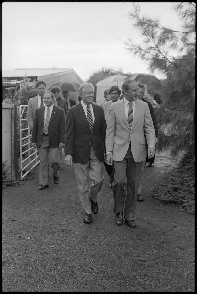 This image was taken by the Evening Standard on the 11th of February 1984 but was not published. It depicts former United States president Jimmy Carter and his wife Rosalynn visiting Highden Park - Herrick and Judy Perry's thoroughbred stud farm at Awahuri.