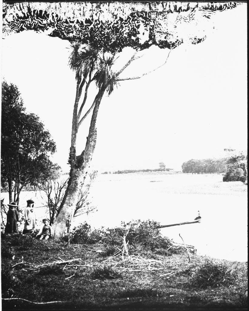 Karere Lagoon is one of the many ox-bow lakes along the banks of the Manawatū River. The original photograph is captioned “Mr Monrad’s. A lagoon at Karere with maori canoe”. The children are probably those of Olga and Viggo Monrad, who farmed beside the lagoon. Karere is situated at Tiakitahuna, between the Manawatū river and State Highway 56.