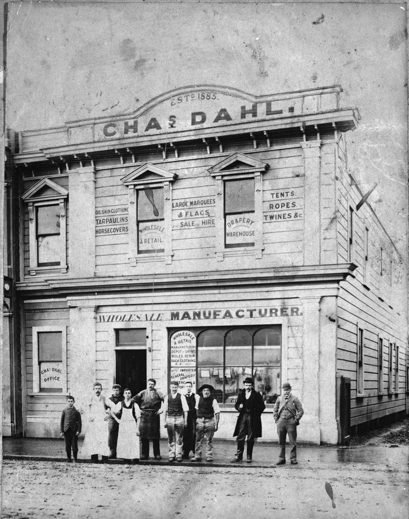 Charles Dahl was a manufacturer of tarpaulins, horsecovers, marquees, tents, ropes and twine, as well as shirts, moleskins, denim and duck clothing. His business was situated between The Square and Princess Streets. The building was demolished February 1968. Charles Dahl is pictured on the far right.