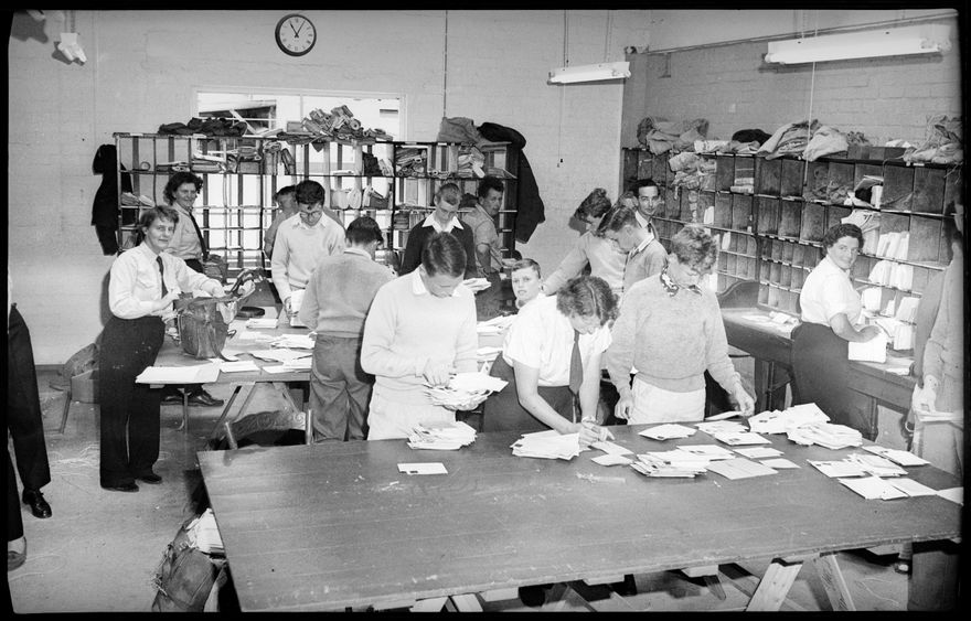 This image was taken for a story that ran in The Manawatu Evening Standard on 13 December 1960 "It is at this time of the year that the postman is busiest as the peak of the Christmas postings is reached. Shown in this photograph is the postmen's room where a number of men and women are seen preparing for the day's round aided by schoolboys employed as assistants."