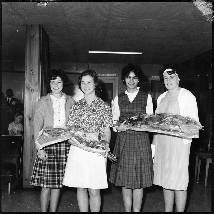 This image was taken for a story that ran in The Manawatu Evening Standard on 24 January, 1963. "... Pictures above are the girls with their two "sisters," who will be their companions this year. From the left are Misses Linda Brasell [Palmerston North], Katherine Robinson [Huston, Texas], Phyllis Cash [Syracuse, New York] and Miss J. Hendra [Palmerston North]." For the full story, see paper.