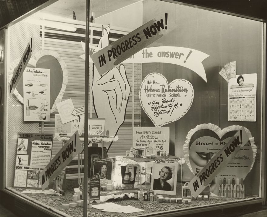 Advertising for Helena Rubenstein Beauty Schools, held in the PDC tearooms. The original Premier Drapery Company building was owned by Watchorn & Co and then W F Durward until it was reorganised into the PDC in 1915 when bought by James Wallace. In 1956 the company was taken over by the Manawatu Co-Op Society and renamed the Premier Department Store. The PDC was demolished in 1990 to make way for the Plaza Mall and ceased to exist.