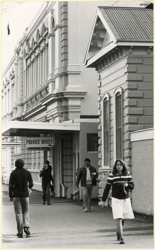 This photograph shows the stretch of pavement outside the Chief Post Office on Main Street East. This building was Palmerston North’s fourth Post Office, operating from 1906-1988. The original 1906 building was extended towards Broadway and up Main Street in the early 1920s and in 1937. It was originally built with a clock tower but this was removed in 1942 after an earthquake for safety reasons and the clock and chimes were re-housed in the ‘new’ clock tower in The Square in 1957.