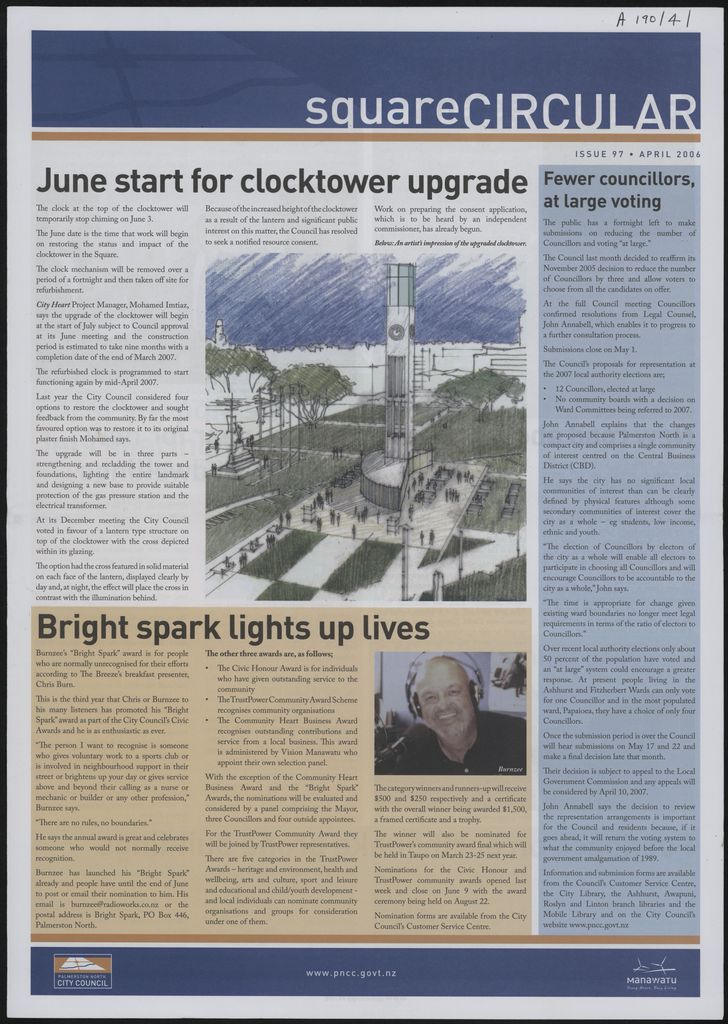 The Square Circular was Palmerston North City Council's monthly community publication, informing Palmerstonians of PNCC initiatives, activites, and events. This month's issue includes: Clocktower upgrade; civic awards; Draft Long Term Council Community Plan; Awapuni landfill renewable energy award; funding boost for youth higher education project; miniature railway; Mihaere Drive; Inspire Net Jets; shared pathway opening; earthquake prone buildings; Centrepoint; Square Edge; stormwater pipes; computer sales.