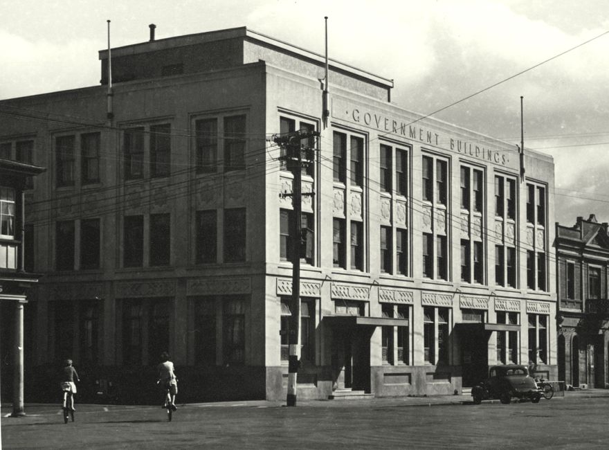 Originally known as 'Manawatu Buildings', this structure on the corner of George and Cuba Streets was erected in 1929 for Messrs. A. H. White, E. D. Berry and R. A. Port. The architect was C. Tilleard Natusch of Wellington. The three-storey building was constructed from reinforced concrete and featured marble-terrazzo floors and stairways. It originally housed the Dominion Sample Rooms on its first and second floors. On the ground floor, there were six shopfronts located on George Street and a further four on Cuba Street. In 1945 the NZ Government purchased the building and had it modified to house Government offices, including the Land and Income Tax Department and Social Security Office. It was subsequently known as 'Government Buildings'. The structure was demolished in 1992 to make way for a supermarket. It was later converted into a Harvey Normans store.