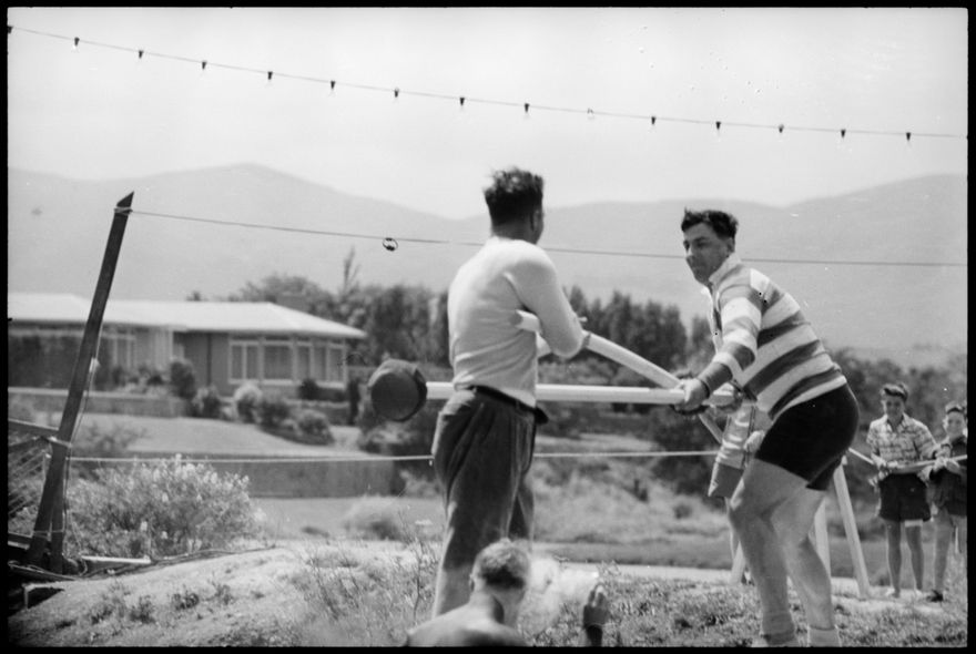This image was not published in The Manawatu Evening Standard, taken on 21 January, 1964. "During the jousting tournament for the "wooden spoon" at the Carnival of the Lake, between Army and the "Kouncil Knights" disaster overtook the City Council crew. Coming in to attack, they turned broadside on and were dealt a mortal blow by Army. A thunderflash, thrown into the water, exploded under the keel and blew a hole in the plates. looking like a submarine diving, the gondola sank in a dignified dive, leaving the crew floundering in the lake. Navy divers and the Army soon salvaged the stricken vessel." See Also: 2017N_2017-20_018340, 2017N_2017-20_018341, 2017N_2017-20_018343, 2017N_2017-20_018344