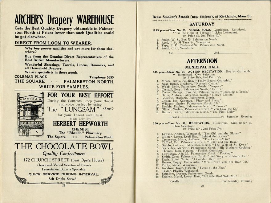 Manawatū Competitions Society, Official Programme, Twenty-Second Annual Festival