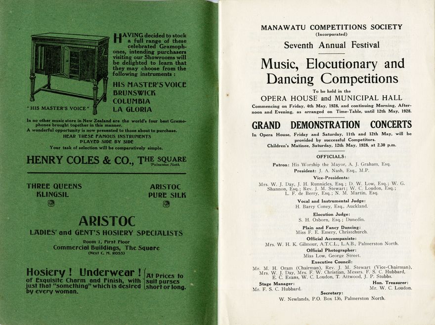 This is the programme for the Seventh Annual Festival of the Manawatū Competitions Society, which was held in the Opera House and Municipal Hall between 4 and 12 May 1928. The competition categories included elocution (speech and drama), dance and music (both vocal and instrumental). Most entrants were children or young people. In addition to listing the events and names of competitors, the programme includes advertisements for local businesses.