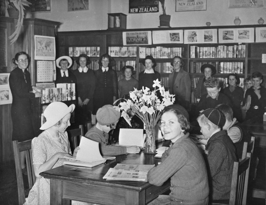 The Children's section of the library was on the upper floor of the Palmerston North Public Library. The Library was purpose built on the corner of Fitzherbert Avenue and The Square in 1928. The Junior Library went from a subscription basis to a ‘free’ library in 1938, resulting in a huge increase in membership. Not long after this photograph a new Junior Library was opened in two converted shops on the ground floor with its own entrance. Activities at the library included Saturday morning story readings, the Junior Library Players performing plays competitively and to the public, a Play Reading Circle, a Scrapbook Club making picture books for overseas and the hospital, and film screenings in winter.