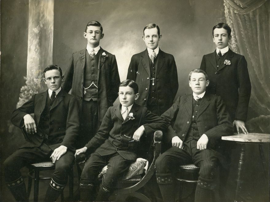 Formal group photograph of 6 young men. Seated on the left is William Andrew Chapman (‘Will’ – then aged 16), younger son of local sheep and dairy farmer William Chapman. Also identifiable (standing, left) is Campbell Aitchison who features in other photos – see for instance 2013N_Pi527_006843. Although the photo is mounted on card, there is no information to explain how the 6 are associated. Both identified persons (and therefore the others?) are known to have taken and passed their Junior Civil Service Examination in 1911.