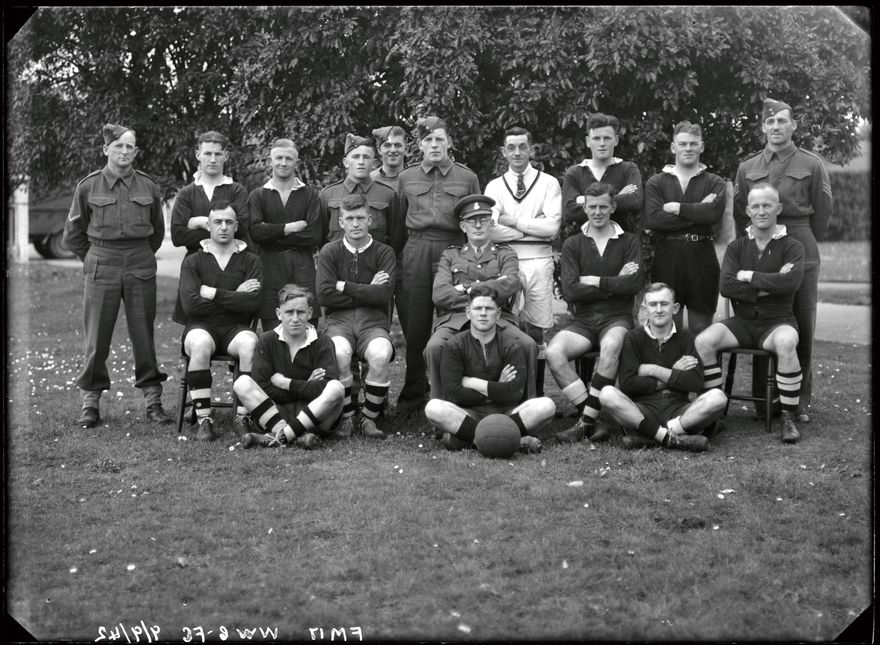 A WWC Football Club team made up of a mixture of men in civilian clothing and military uniform.