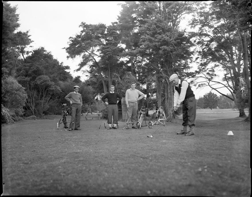 This image was taken for a story that ran in The Manawatu Evening Standard on 10 October 1958: "A study in concentration at the Hokowhitu golf links this morning as M. P. O'Keefe prepares to tee-off during the annual accountants' golf tournament. Watching him (from left) are: A.R. Gibson, R. Keating and J. Thorburn. "