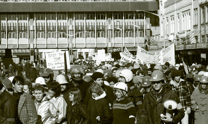 Anti-Apartheid and anti-Tour protest vanguard on match day.