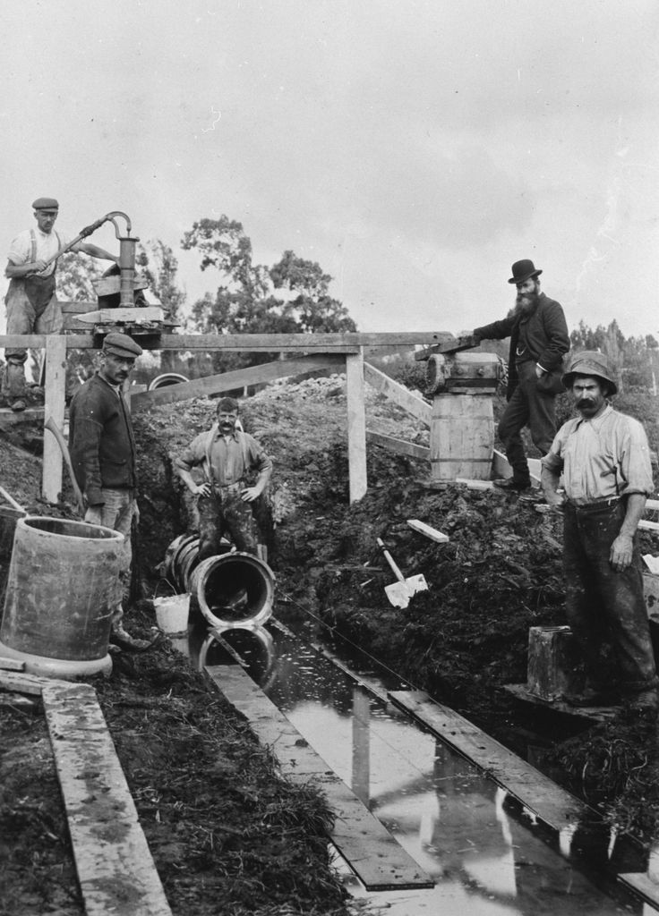 This 18 " sewer was laid on a ferro concrete support as the land was swamp 14 foot deep. Samuel Jickell, also the photographer, was Borough Engineer for the Palmerston North Borough Council 1904-1919.