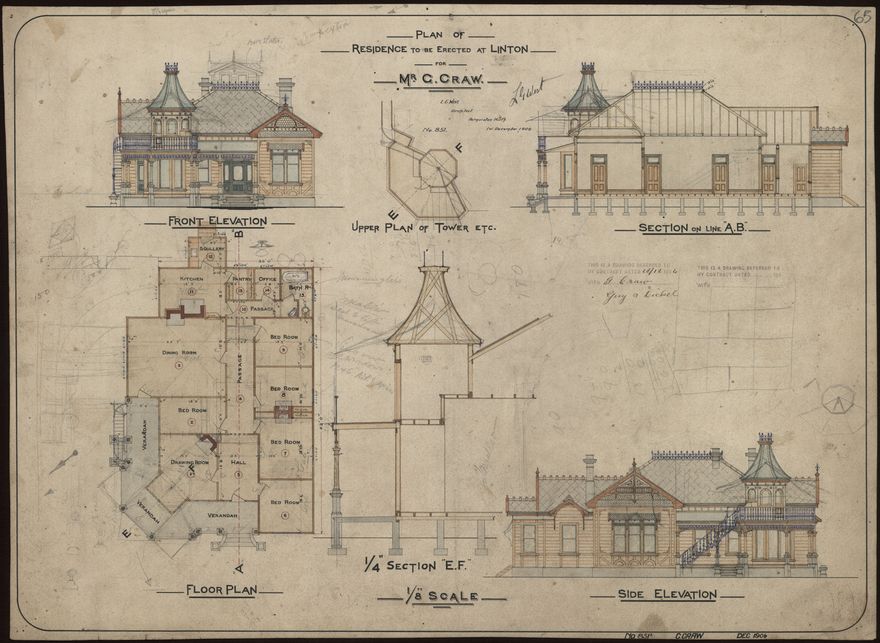 These plans for an ornate, single-storey residence with a tower were designed by L. G. West for G. Graw. The Danish-born architect Ludolph Georg West (1846-1919) established an architectural practice in Palmerston North in about 1880. In 1912 he formed a partnership with is son, Ernest Vilhem West, who continued the business after his father's death.