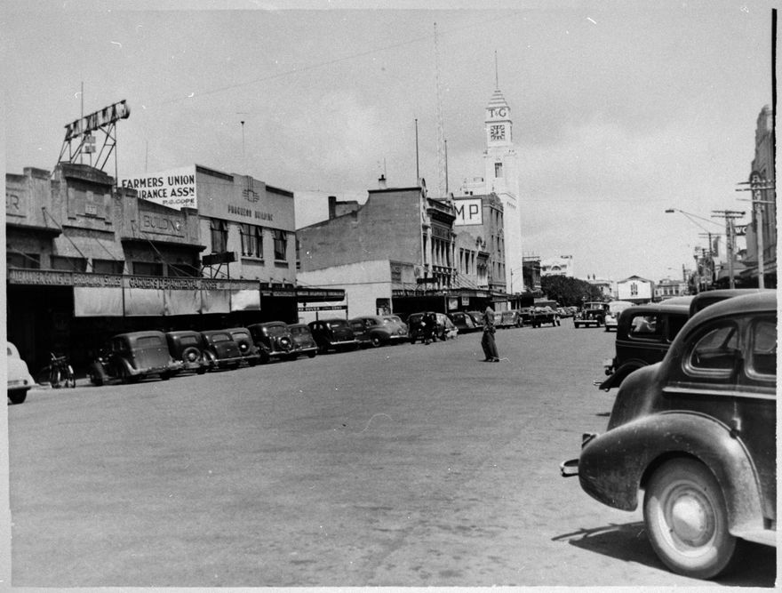 This photograph was taken looking along Broadway into The Square. Some of the businesses that line the street are, from left: Alexander Gowns; Broadway Shoes; Garners Department Store; Progress Building; The Manawatu Daily Times office; Australian Mutual Provident Society (AMP); Australian Temperance and General Mutual Life Assurance Association (T&G Building). At the end of the street can be seen the Mayfair Theatre, on George Street.