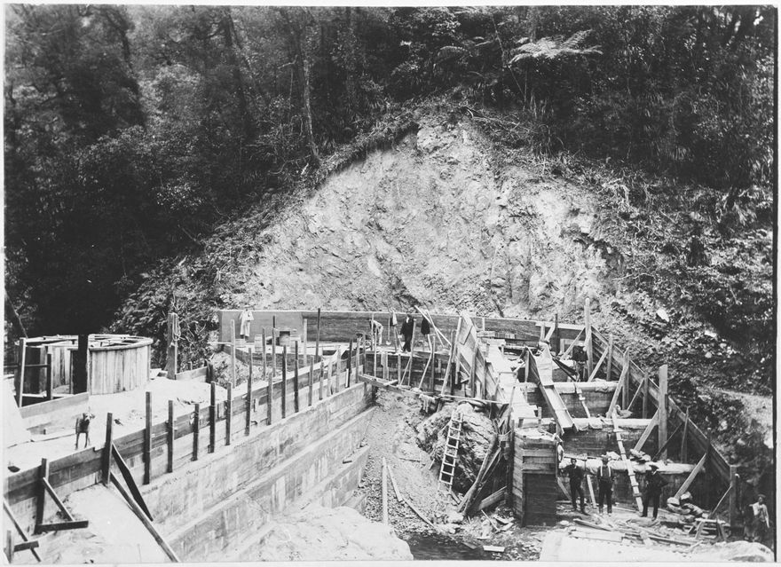 Samuel Jickell, shown here on the far right at the foot of the construction, was Palmerston North Borough Engineer from 1904-1919. This dam was originally completed in 1907 but was raised to 50 feet in 1912. It was officially opened February 17 1913. This enlarged dam remained in use until 1957 when a 100 ft high dam was constructed.