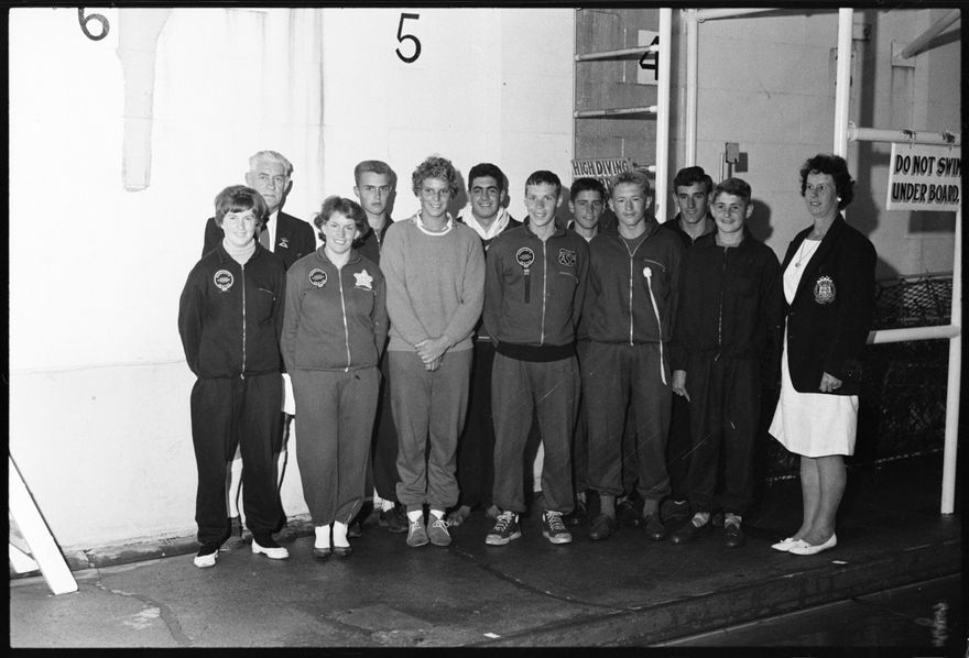 This image was taken for a story that ran in The Manawatu Evening Standard on 20th February 1963. "Pictured are the Manawatu Swimming Centre's representatives who have been selected to attend the New Zealand swimmming championships to be held at the Newmarket Olympic Pool, Auckland between February 26 and March 2. They are from left: Back row, Mr J. Hogan (manager), K. Stevens (captain), B. Vertongen, I. Burt, K. Gracie. Front row, Misses V. Toye, O. Kirkby, V. Haddon, F. Bell, K. Greer, V. Barnao and Mrs R. Haddon (chaperone)."