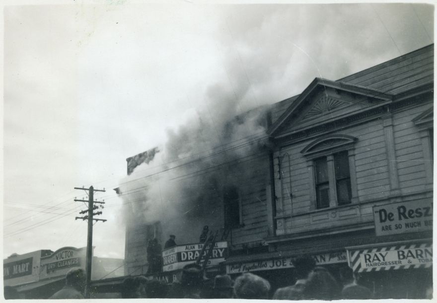 This photograph shows smoke billowing from the front of the building that housed the Alan Bramwell Drapery. Also visible is Victor Dry Cleaners (left), a fruiterers (right) and a hairdressers that begins "Ray Barn-". It is unknown where this building is, but based on photographs that are in the same collection it is estimated the fire happened in the 1950s.