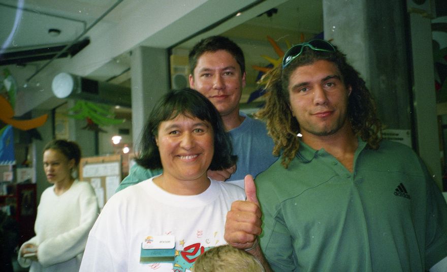 Matua Parkinson visited Palmerston North City Library with Jonah Lomu and several other members of the Hurricanes Rugby team. Matua is seen here with library staff members Huatahi Nuku and Ross Meads.