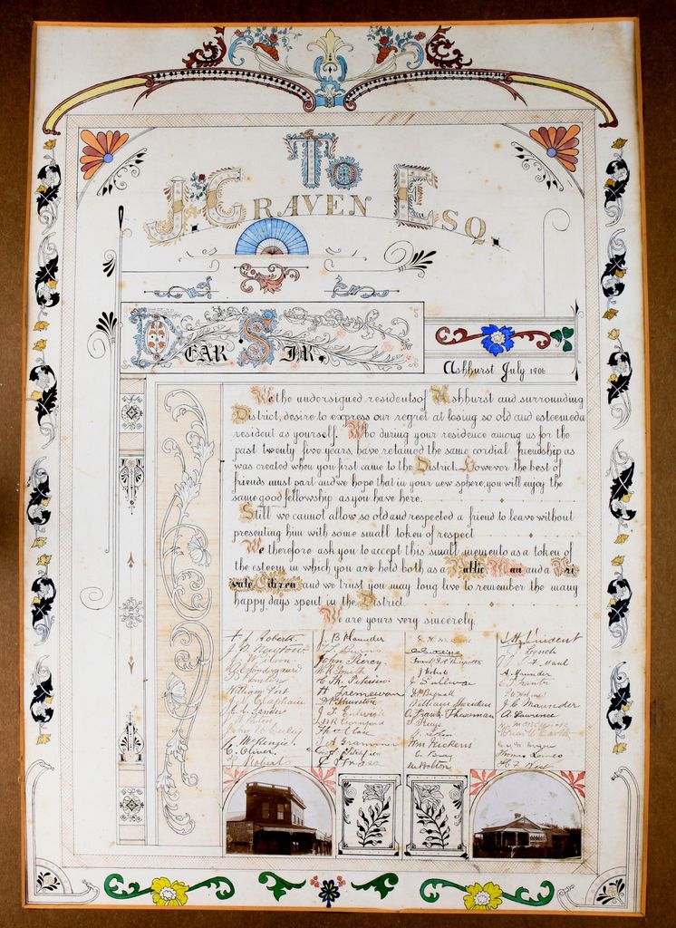 Illuminated address presented to J Craven by the residents of Ashhurst in July 1906 in recognition of his service to the local community for 25 years. Signed by 52 members of the Ashhurst community.