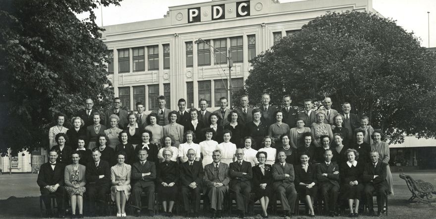 Photograph taken in The Square, with the PDC building behind, on the Church Street side of The Square. The Premier Drapery Company was established in 1915. In 1956 it was renamed the Premier Department Store, when the company was taken over by the Manawatu Co-Op Society. It was closed in 1990 and demolished to make way for the Plaza Mall. From left. Back row: ? Toomath, Albert Mollett, Keith Friend, John Glasgow, Jack Jensen, Bill Howell, Ray Blair, ? Sorenson, ? O’Meagan, ? Ellison, ? Meyer, ? Elsmore, Bert Holdsworth. Second row from back: Mrs Just, ? McMillan, Phyllis Valentine, Flora Irwin, Pat Cox, Lesley Mew, Marion Sanne, Joan Skeates, Maureen Hardy, Elva Hansen, Mavis Hanlon, ? Elsmore, Florence Ram, ? McKirdy, ? Dobson, Noel?. Third row from back: Norma Nott, Joy Dunstan, Joan Storey, Margaret Bigham, Eileen Quinn, Maureen Duncan, Joyce Guthrie, ? Elsmore, Dawn? Elsmore, ? Smillie, ? Jones, ? Whitaker, Zelda Garrick, Ivy Mills, ? Bardaboes, Jean Blackbourne, ? Jackson Front row: ?Packer-Doust, Helena Houseman, Lionel Orme, Betty Harris, Ron McCarty, ? Carlisle, George Orme, Bill Sexton (Manager), Andrew McKecknie (Secretary), Ethanie Harrison, Alan Harris, Eugenie Moseley, Frank Honore, Eila Francis, ? Gough (row contains Heads of Departments)