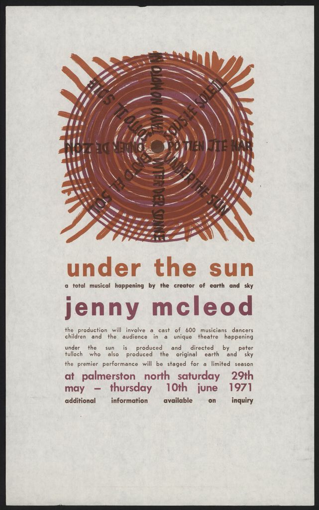 Jenny McLeod was commissioned by the city of Palmerston North to compose music to commemorate its centenary in 1971. The resulting work, Under The Sun, was performed twice during Palmerston North's Centennial production, on 29 and 30 May 1971. With Under The Sun, ‘New Zealand ceases forever to be a provincial society’ wrote playwright Bruce Mason in the New Zealand Listener.