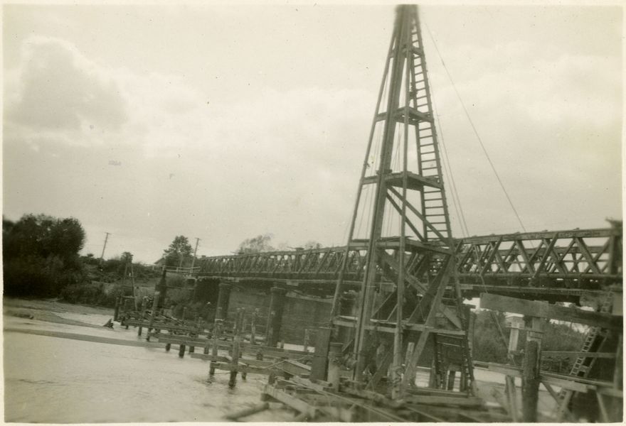 The Fitzherbert Bridge, spanning the Manawatu River, Palmerston North, was built 1933 – 1935. This view shows the preparations for the construction.