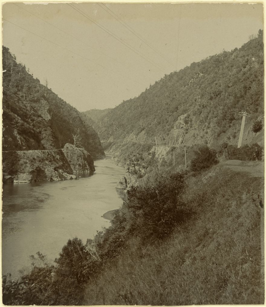 The Gorge road was completed in 1872, linking Manawatu with the Hawkes Bay. A telegraph line was constructed through the Gorge between 1879 - 1880. On the left hand side can be railway line.