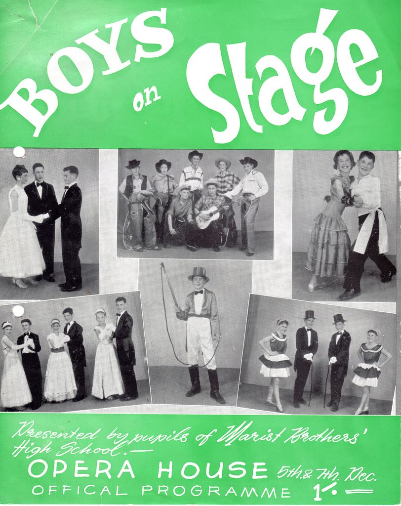 Programme for musical production. Boys on Stage was a stage show put on by Marist Brothers High School in 1963, initially at the Opera House, and by popular demand, for two more nights at The Regent. All the participants were male students at the school, albeit well disguised by the (parent) make-up artists. Marist Brothers' High School opened in 1939 and became a full secondary school in 1942. It closed in 1974, with the opening of St Peter's College.