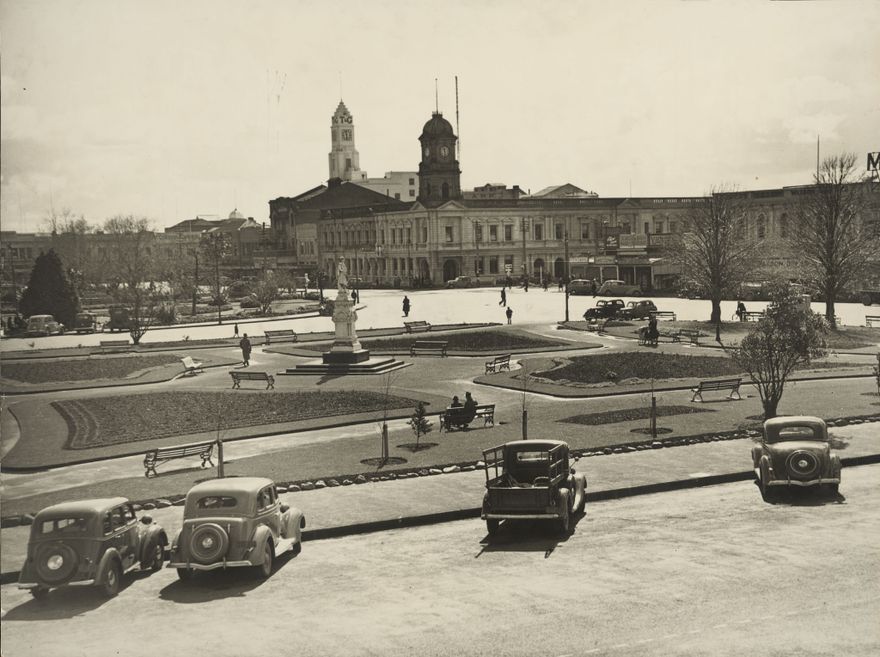 The Te Peeti Te Awe Awe statue stands in the middle of the quadrant of The Square near Church Street. The clock tower was removed from the Post Office after an earthquake in 1942.