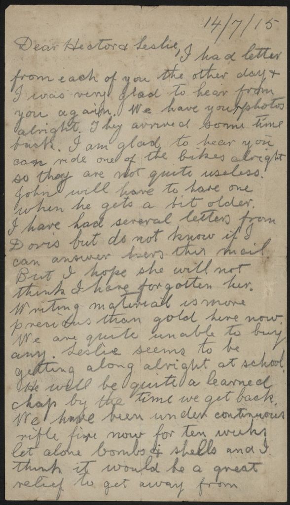 Pat (Percival) Argyle (1890-1915) was one of the sons of Henry and Alice Argyle of Bunnythorpe. He and his brother Len enlisted in the NZ Expeditionary Forces together and served in World War One. This letter from Pat to his young brothers, was sent from Gallipoli in Turkey, and talks about what they are experiencing.