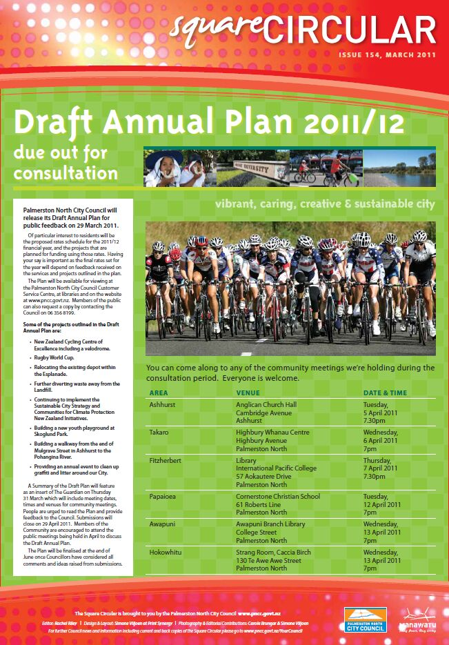 The Square Circular was Palmerston North City Council's monthly community publication, informing Palmerstonians of PNCC initiatives, activites, and events. This month's issue includes: Draft Annual Plan; Dog Registeration; Events; Civil Defence; Recycling; Volunteers; Sustainability.