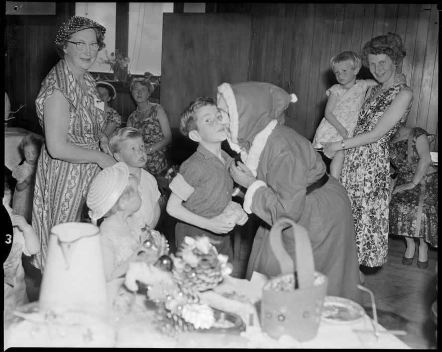 This image was taken for a story that ran in The Manawatu Evening Standard on 3 December, 1959. “James Cook enjoyed the novelty of having Mother Christmas kiss him at the Takaro Ladies’ Club party yesterday afternoon.”