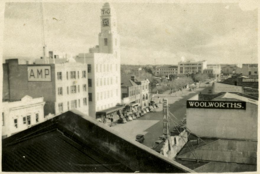 A view from the projection room at the Regent Theatre, looking down Broadway in a southerly direction, towards The Square.
