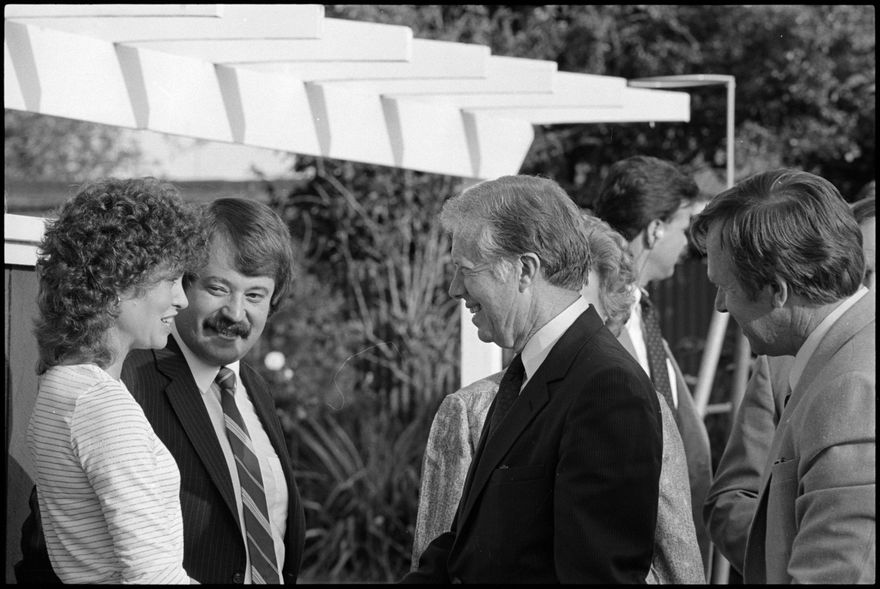 This image was taken by the Evening Standard on the 10th of February 1984 but was not published. It depicts former United States president Jimmy Carter and his wife Rosalynn arriving in the city for a three-day visit. They were greeted by members of the Lions Clubs of Central Districts and Manawatu and civic leaders such as Mayor Brian Elwood.