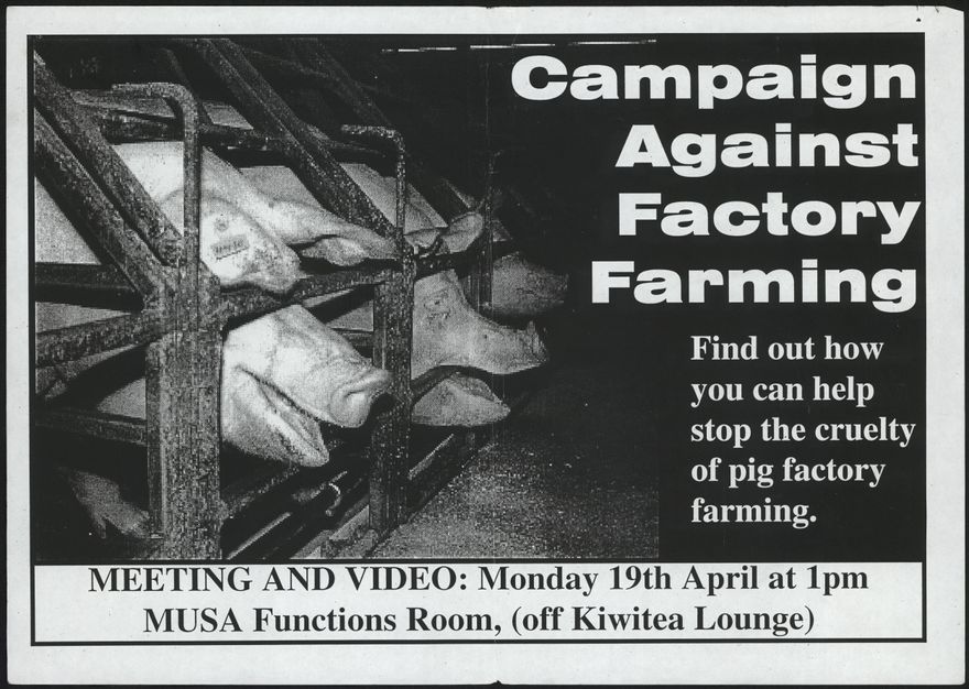 Campaign Against Factory Farming. Find out how you can help stop the cruelty of pig farming. Meeting and video. Monday 19th April at 1pm. MUSA Functions Room (off Kiwitea Lounge).
