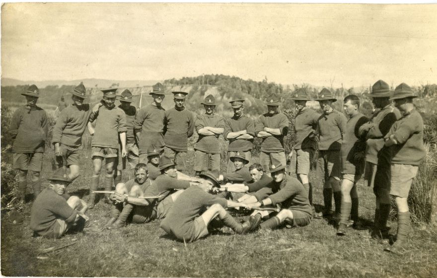 A group of eight soldiers sit on the ground and perform various exercise involving thin sticks, while being watched by fourteen others who stand behind them. It was probably taken at the Awapuni Racecourse, which was home to one of New Zealand’s largest training camps in World War One, and was the sole location for training the New Zealand Medical Corps. staff.