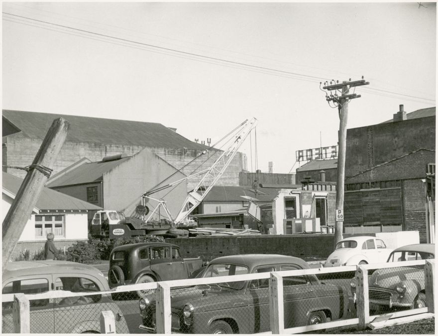 This series of images depicts the development of the site at the corner of The Square and Main Street (east) over the period of 17 June 1963 – 5 April 1965. During this time these existing buildings including the former Municipal Council Offices/Third Public Library the former Manawatū Evening Standard offices, and the corner retail building) were demolished to make way for the construction of a new public library. The public library was officially opened on 4 November 1965. This view is from Main Street.