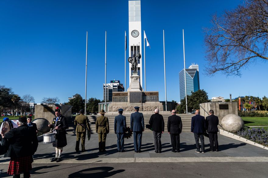 Palmerston North marked the 75th anniversary of the end of the second world war on 15 August, with a wreath-laying service at the Cenotaph in the Square. Dignitaries were piped on to the concourse by the Pipes and Drums of Palmerston North. As well as the wreath laying, city flags flew, a lament was piped and the clocktower bells rang.