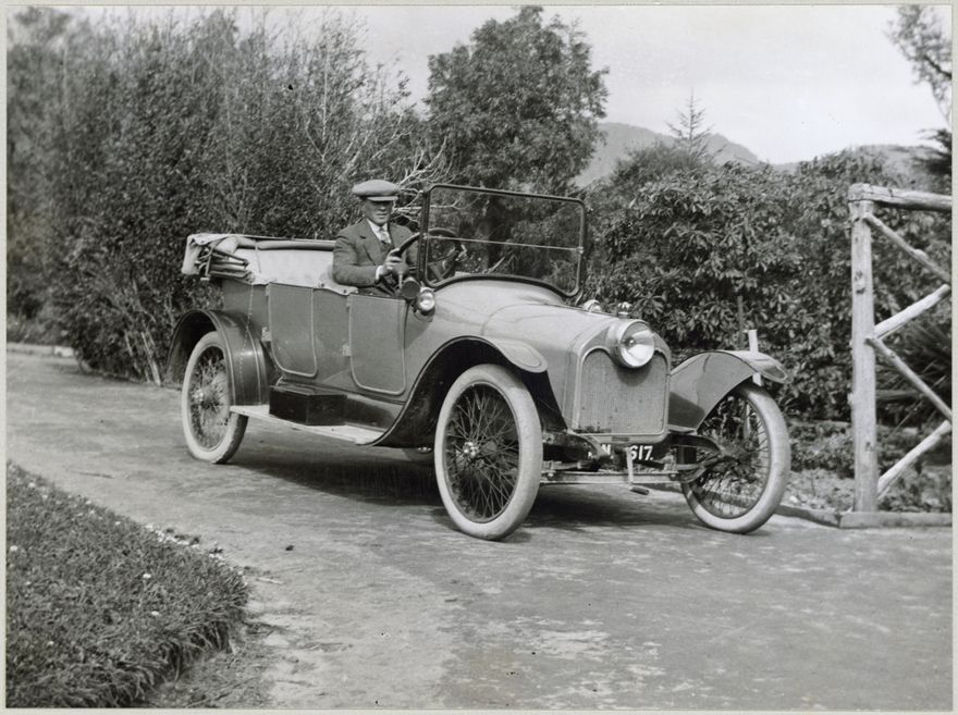 Arthur or Edwin (Ted) Akers in car, Ashhurst district