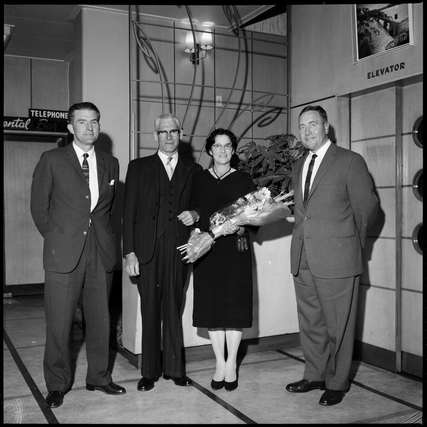 This image was taken for a story that ran in The Manawatu Evening Standard on 13th February 1963. "Last night saw the termination of 30 years of service with the Palmerston North branch of Woolworths (N.Z.) Ltd., for Mr O. S. New. At a reception held in his honour by the management and staff from many branches, Mr New received a cheque from his employers, to mark his retirement. He was also presented with a garden parasol by his former colleagues. Mr and Mrs New will spend their retirement at Cooper's Beach, North Auckland. Mr A. Camerson, the district manager of Woolworths, presented the cheque on behalf of the company and also presented Mrs New with a bouquet. From the left are, Mr V. H. Beadle (personnel manager of Woolworths); Mr New, Mrs New and Mr A. Cameron (district manager)."