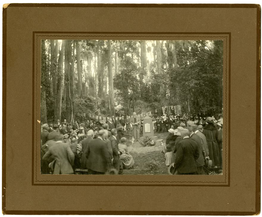 This mounted photograph shows Sir Thomas McKenzie speaking at the opening of the Bruce Park Reserve in Silverhope, Hunterville. For more information on the opening, see this article from the Evening Post.