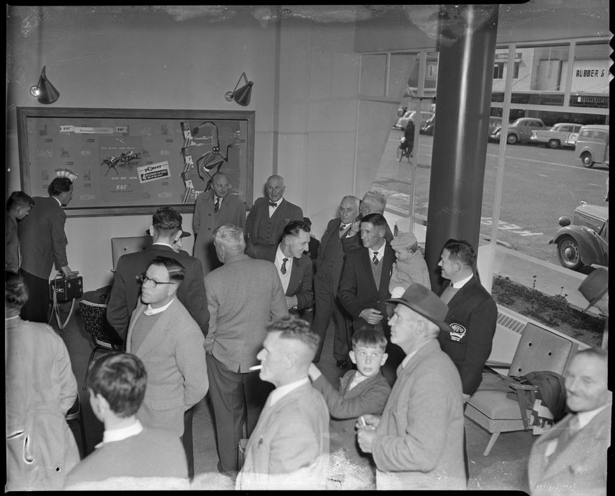 This image was taken for a story that ran in The Manawatu Evening Standard on 09 September 1960 "Discussing the Manawatu Rugby team's prospects in the Ranfurly Shield match tomorrow at the N.A.C. Air Centre yesterday when the party was farewelled are (from the left): Messrs J.T. Hardie (the president of the union), G.M. Rennie (Mayor), Cr. C. Walker, Mr. M.C. Follis (a selector) and the team coach (Mr. L. Morgan)."