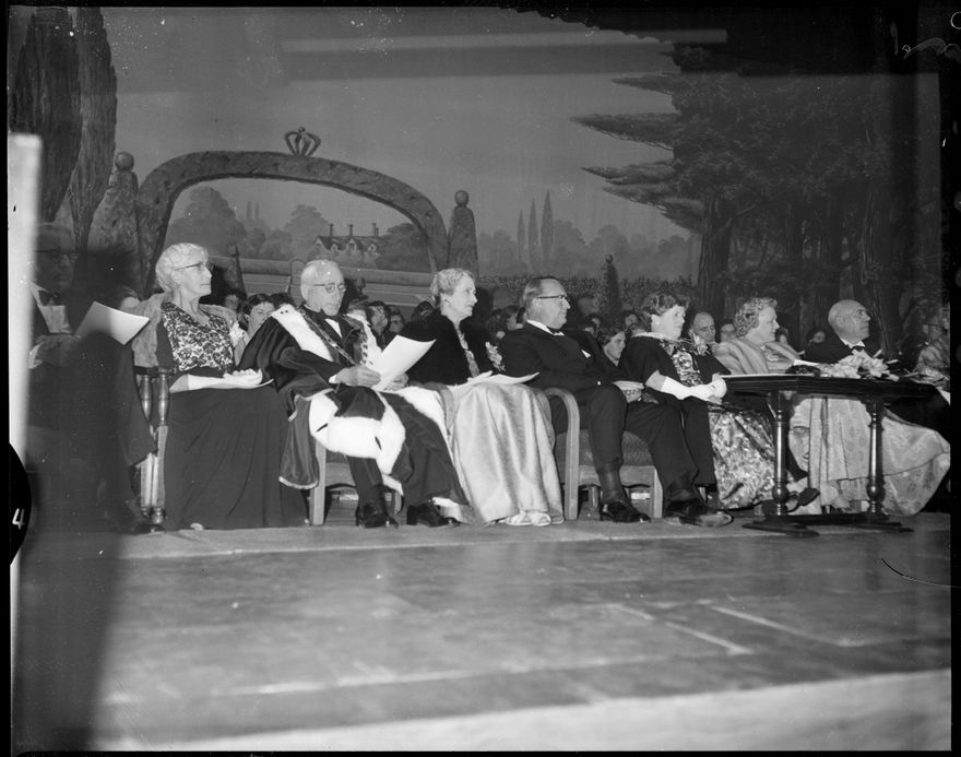 This image was taken for a story that ran in The Manawatu Evening Standard on 07 December 1960 "The Governor-General (Viscount Cobham) was the speaker at the breaking-up ceremony last evening of the Palmerston North Girls' High School. Seated from the left are the Mayor (Mr. G.M. Rennie), Mrs. E. Blechynden, the wife of the chairman of the Board of Governors, Viscount Cobham, the principal (Miss J.N. Wallace) and Lady Cobham."