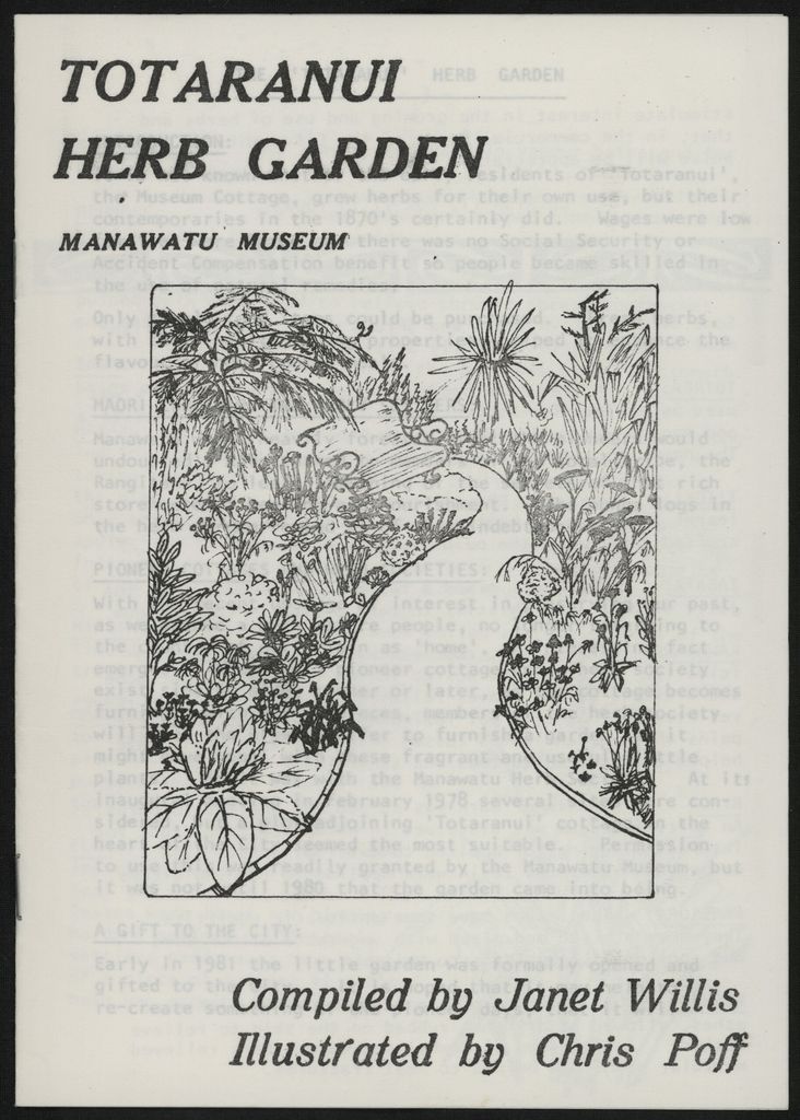 The Totaranui Herb Garden was opened in early 1981 to give visitors an idea about what pioneer gardens might have looked like. This booklet includes a list of some of the native and introduced fauna found in the area that could be foraged for medicinal and household purposes, pioneer recipes and map to the garden's layout.