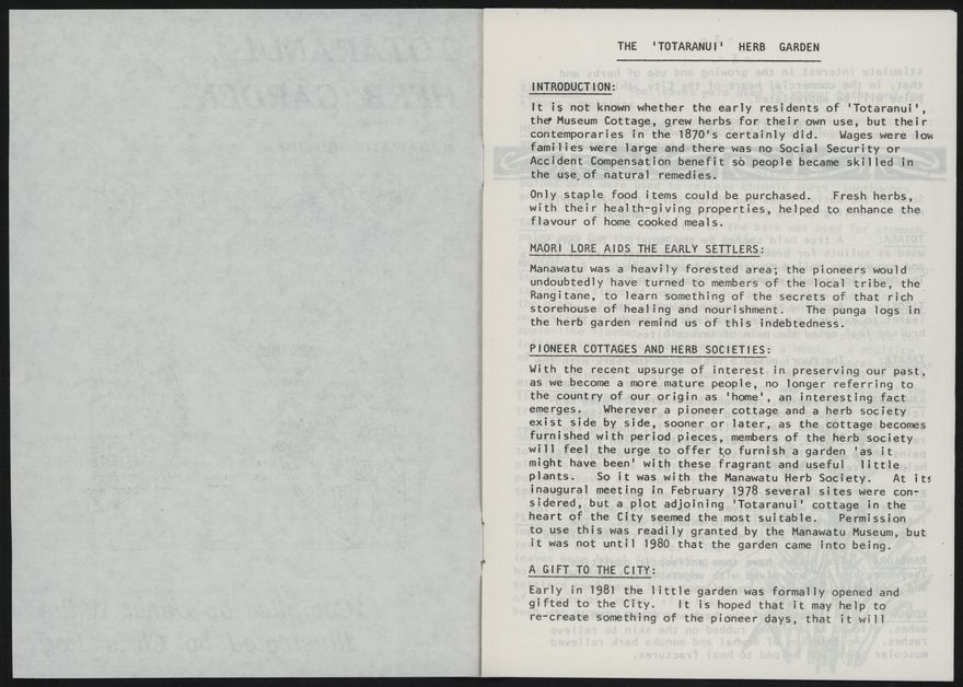 - The Totaranui Herb Garden was opened in early 1981 to give visitors an idea about what pioneer gardens might have looked like. This booklet includes a list of some of the native and introduced fauna found in the area that could be foraged for medicinal and household purposes, pioneer recipes and map to the garden's layout.