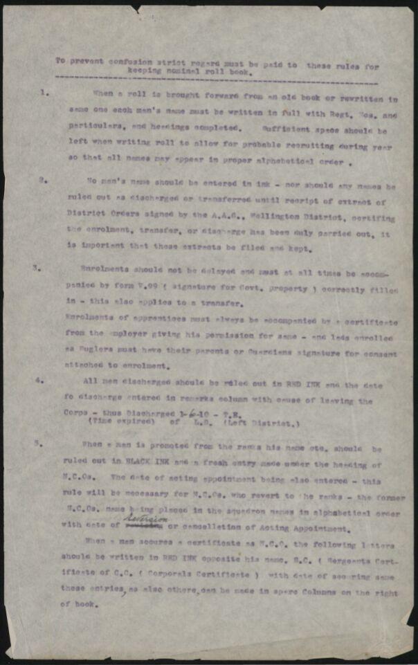 - A document outlining the rules for the keeping of the norminal roll book for the Wellington Mounted Rifles.