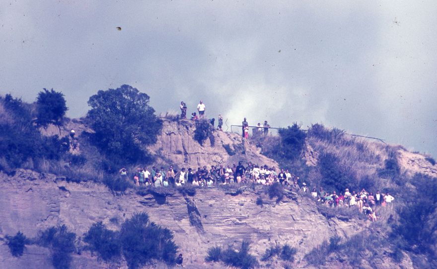 This image compliments a story that ran in The Manawatu Evening Standard on 13th March 1971 "It might have been 100 years ago, but this was the scene in Palmerston North this morning. Mr. and Mrs. G.M. Snelson and their 16-year-old ward Matilda Montgomery..." [Spectators gather above the river bank to watch the re-enactment of the Snelson's canoe landing from 1871.]