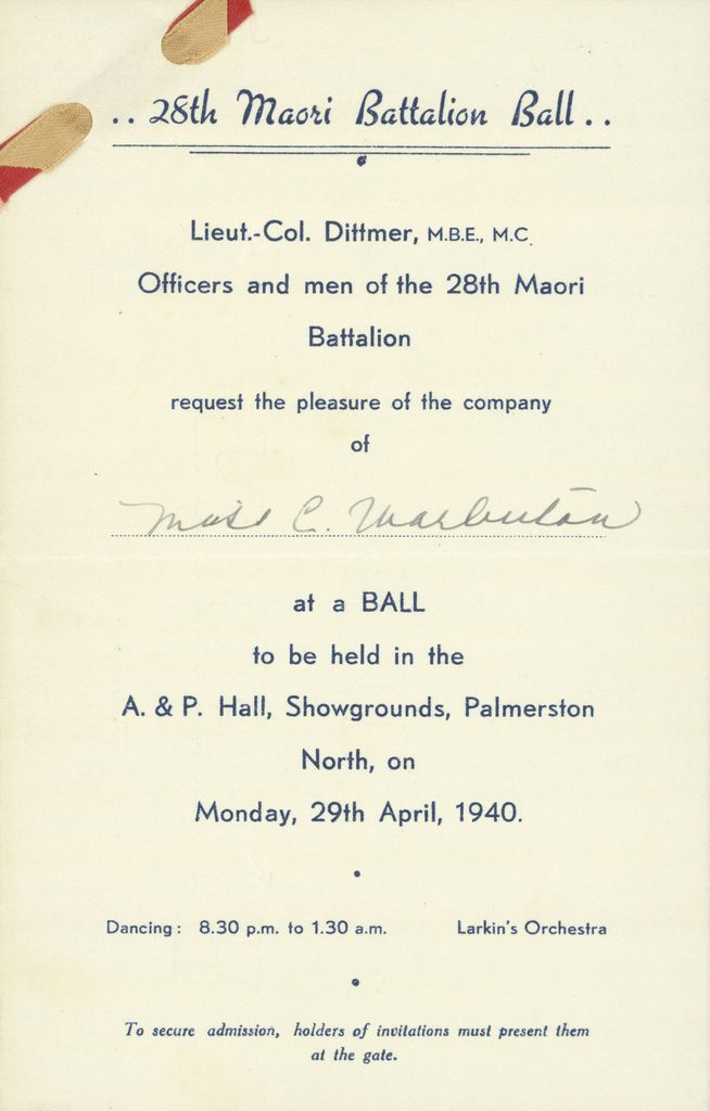 Invitation to Charlotte Warburton, to attend the 28th Māori Battalion Ball held at the Showgrounds, Palmerston North, 29 April 1940. Charlotte Warburton (1883-1961) was chairwoman of the Women's War Service Auxiliary in Palmerston North and was very actively involved in the war effort. From the archive of 'C E Warburton'.